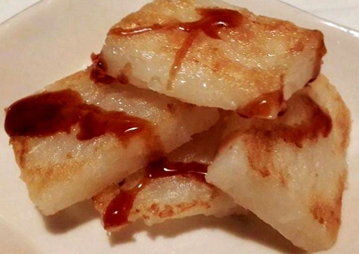 7、取出蘿蔔糕,切成適當大小,入鍋煎到兩面金黃,依個人喜好沾上醬料即可食用。